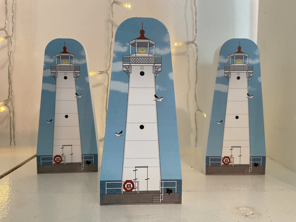 A custom made keepsake from Cats Meow (note the black cat) depicting the Sodus Outer Light. Historical information on reverse side of the wooden art piece.